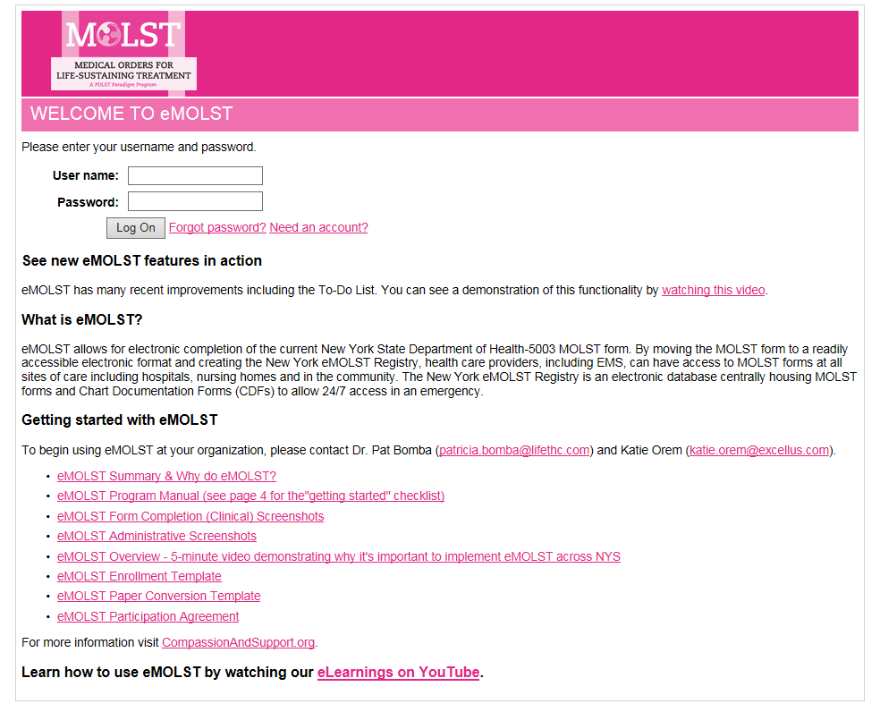 eMOLST also serves as the registry of New York eMOLST forms, which allows easy access to eMOLST forms completed by providers in other care settings. eMOLST forms are printed for any necessary workflow in the paper world, including patient discharge. eMOLST allows physicians to sign MOLST orders electronically. eMOLST ensures quality and patient safety, reduces patient harm and helps achieves the triple aim.