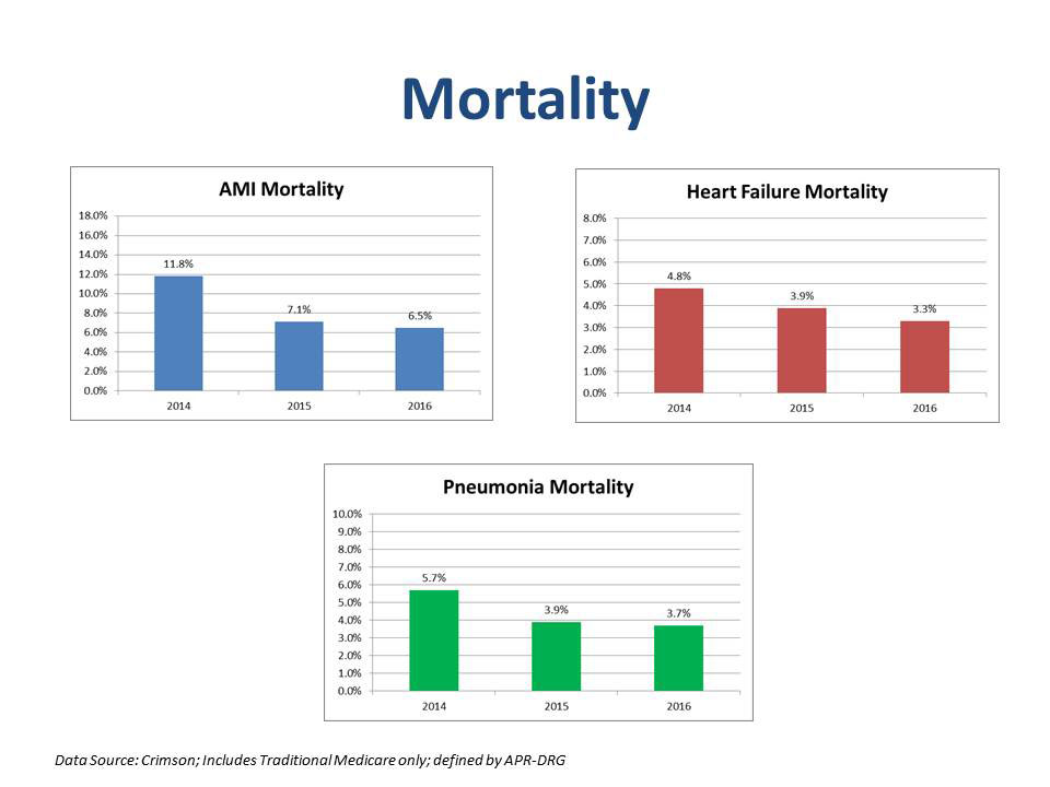click to enlargeMortality rates in the three primary diagnosis categories of acute myocardial infarction (AMI), heart failure and pneumonia have all decreased in the past few years. The incorporation of evidence-based medicine has greatly contributed to the mortality reduction, as well as multidisciplinary rounds and rapid response teams. Kaleida Health is currently evaluating palliative care services to improve the quality of life and care of adults with serious illness.