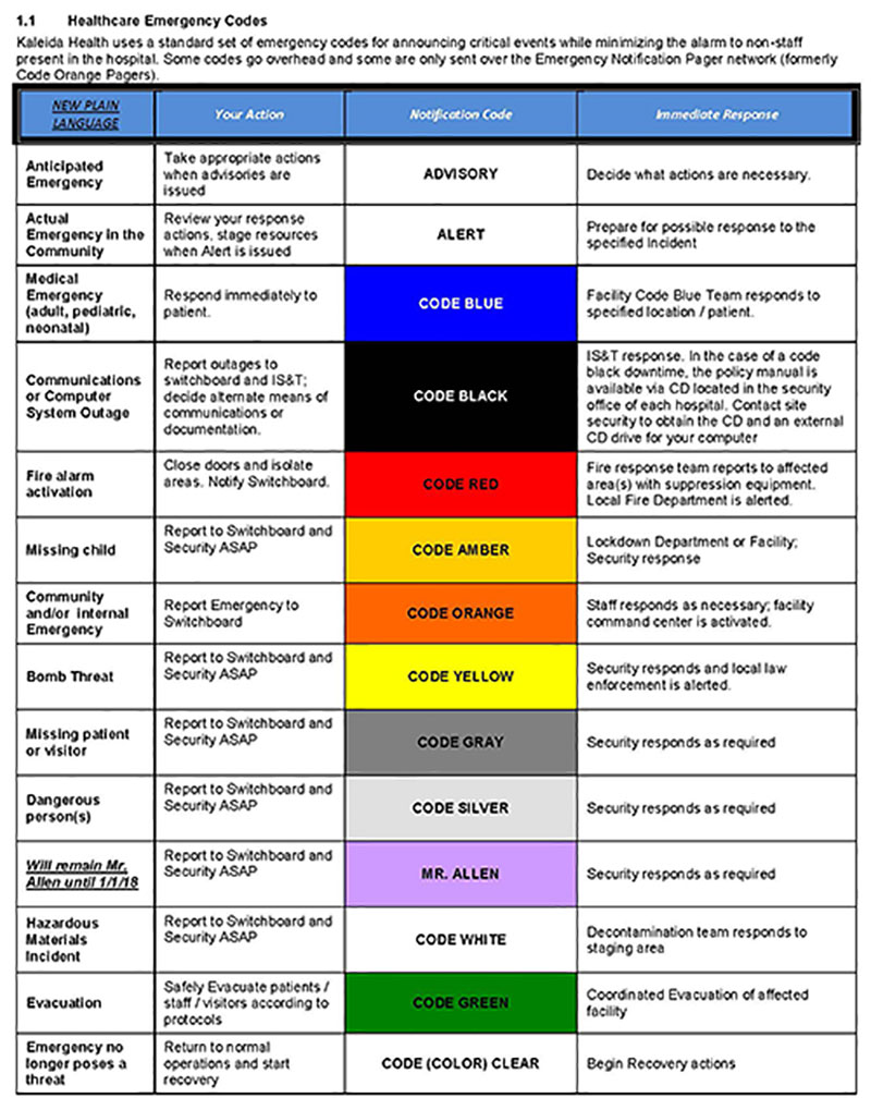 As Kaleida Health transitions to plain language emergency codes, both the color code and plain language code will be announced beginning April 1, 2017 with formal rollout of plain language on May 1, 2017.
