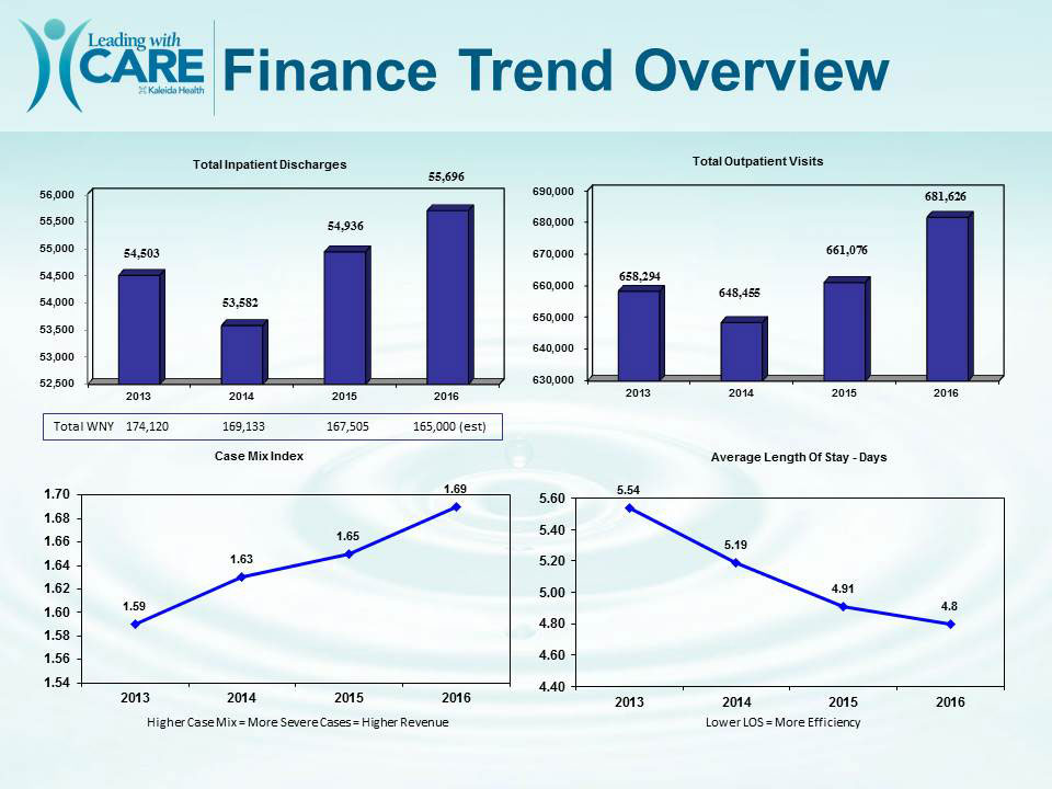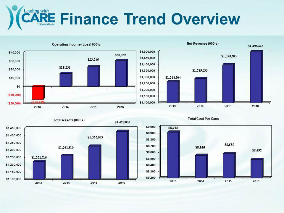 The organization continues to head in the right direction financially. Kaleida Health's total net assets are up, and our bottom line continues to increase. Please see to the right for more details and share this information with your staff.