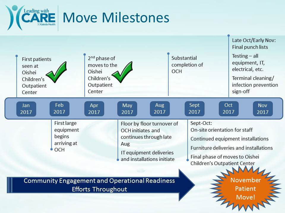 The move to Oishei Children’s Hospital is on schedule. The team has been preparing all aspects of the move including traffic control, vehicles, volunteers and medical leadership to ensure our patients and staff are transitioned safely to their new home. Patient experience remains the one area that, despite considerable efforts, does not reflect the level of care we deliver. Many initiatives will be highly visible over the next several months, and we ask for your help and partnership in championing these efforts.
